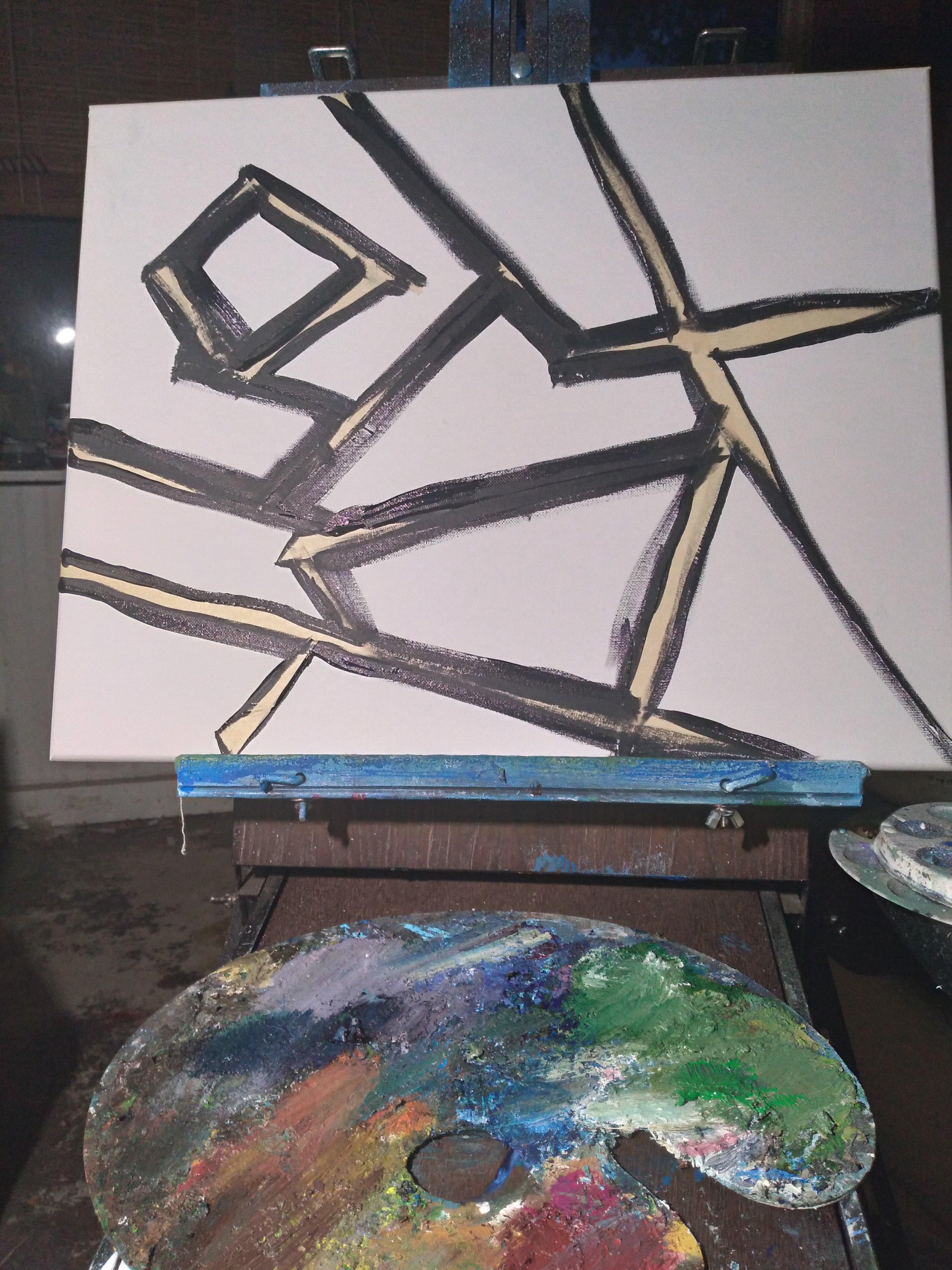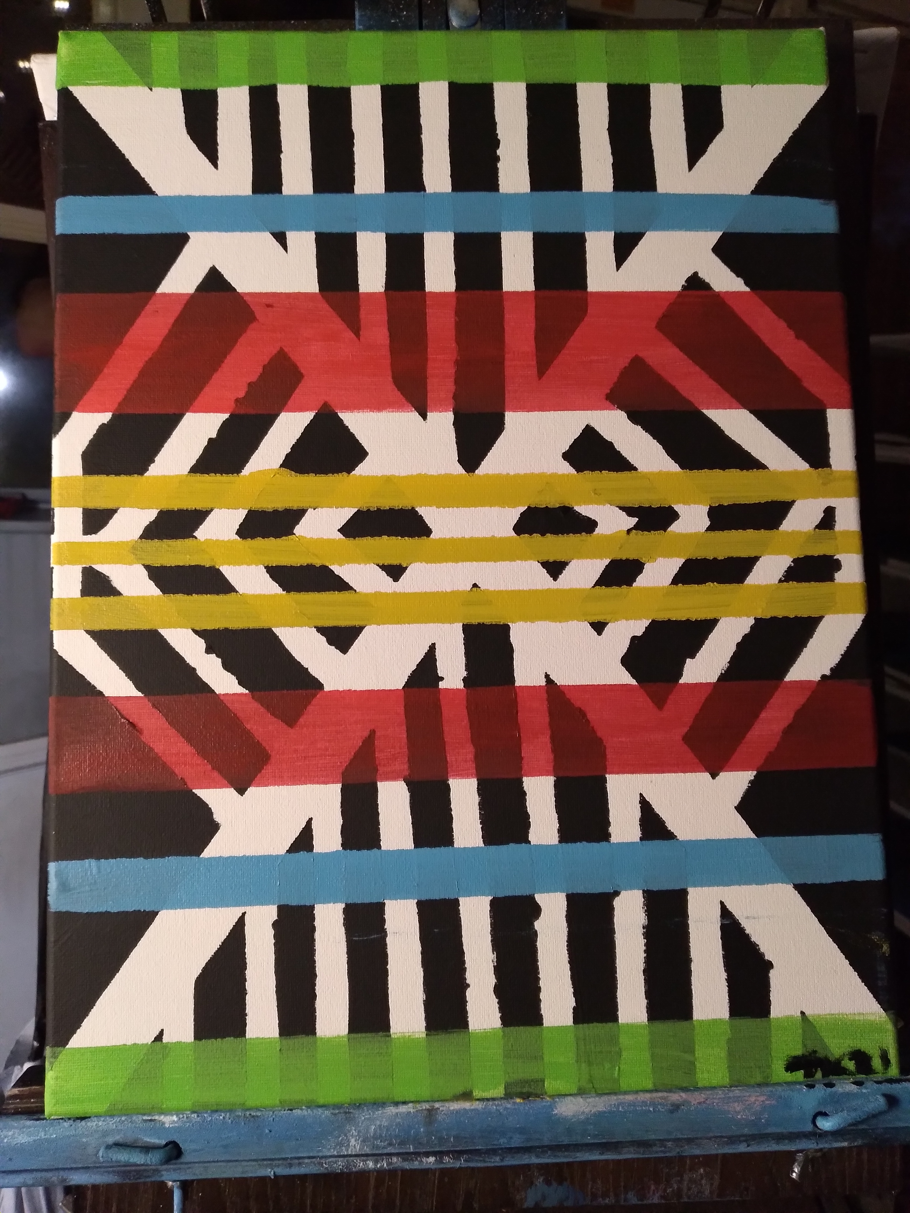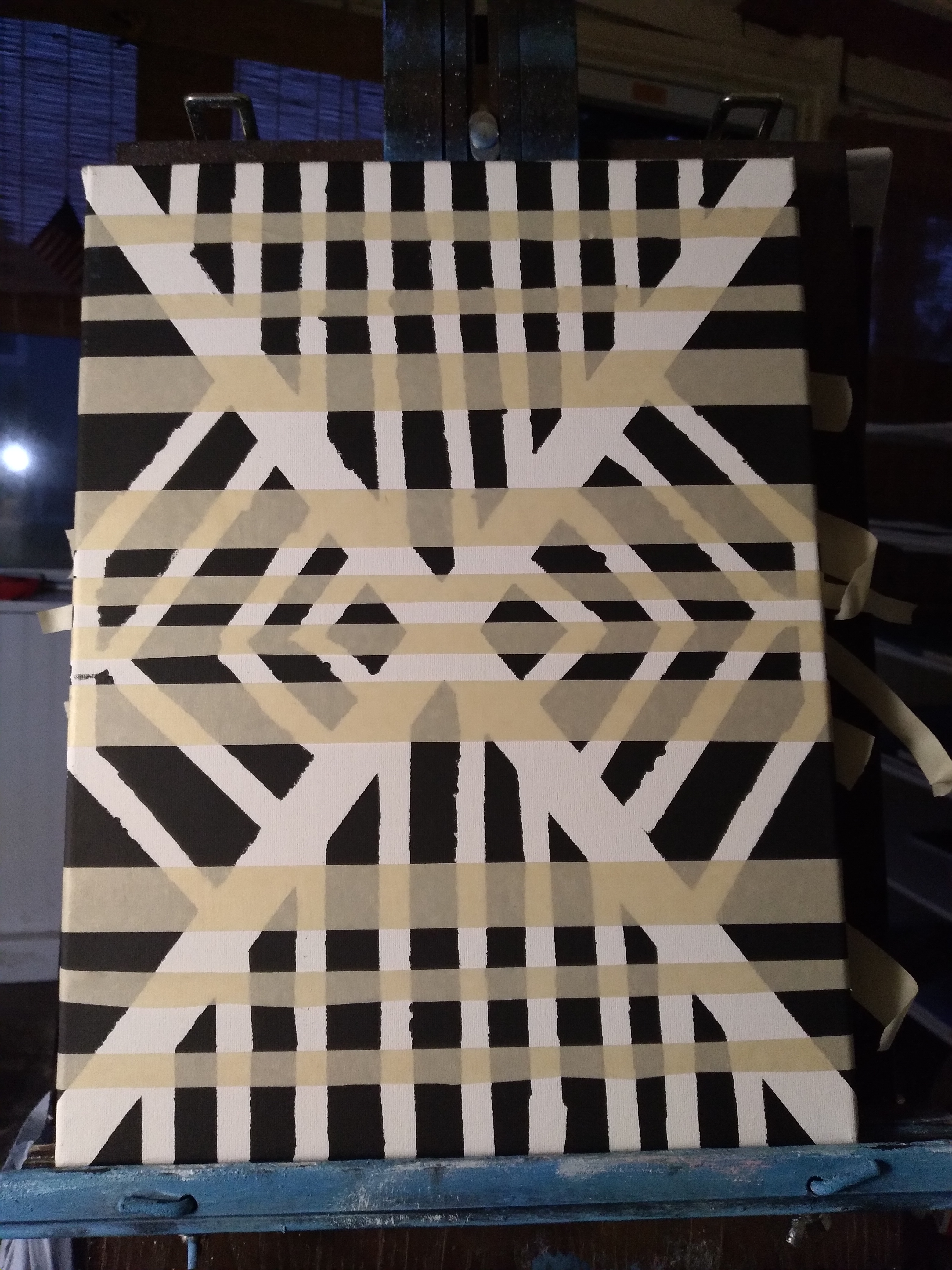 When I first started this painting,I wanted something different. I used a lot of tape. I used black acrylic paint to the design I wanted.
