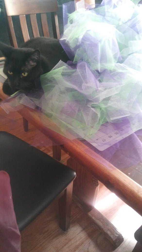I woke up late …so this adds to my challenge…Plus, I have to take my husband to work…This is going to be a late night for me…This is what I woke up to …Shadow watching over my tutu’s…I did manage to get the first tutu half way done….