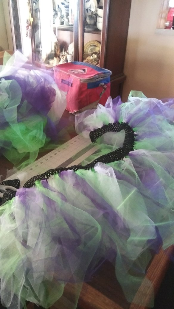 I am making not one but two tutu’s before Wednesday…One for my youngest and oldest daughter…Since I have to work on Halloween…My oldest volenteered…to take her sister trick -treating… I am using 3 yards of glow in the dark tulle,4 yards of neon green, and 4 yards of purple…I am so full of glitter right now….